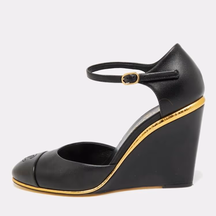 Chanel CC Size 38 Black Leather Wedge Pumps