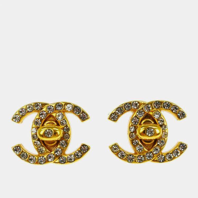 Pre Owned Chanel CC Turnlock Rhinestone Earrings Clip-On Gold Small