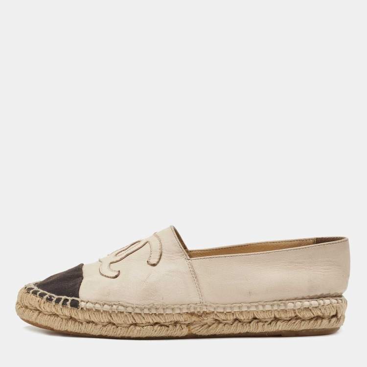 Chanel Cream/Black Leather and Canvas CC Espadrille Flats Size 38
