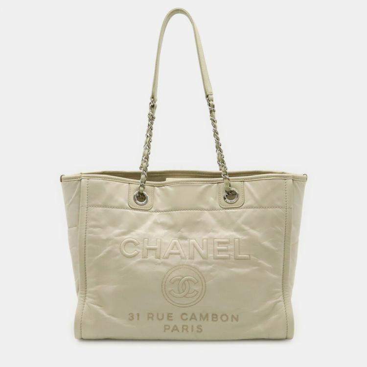 Chanel Deauville Medium Tote Mm Shoulder Bag With Chain Strap White Leather