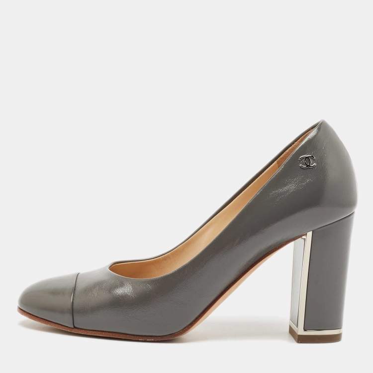 Chanel Grey Leather Cap Toe CC Block Heel Pumps Size 37