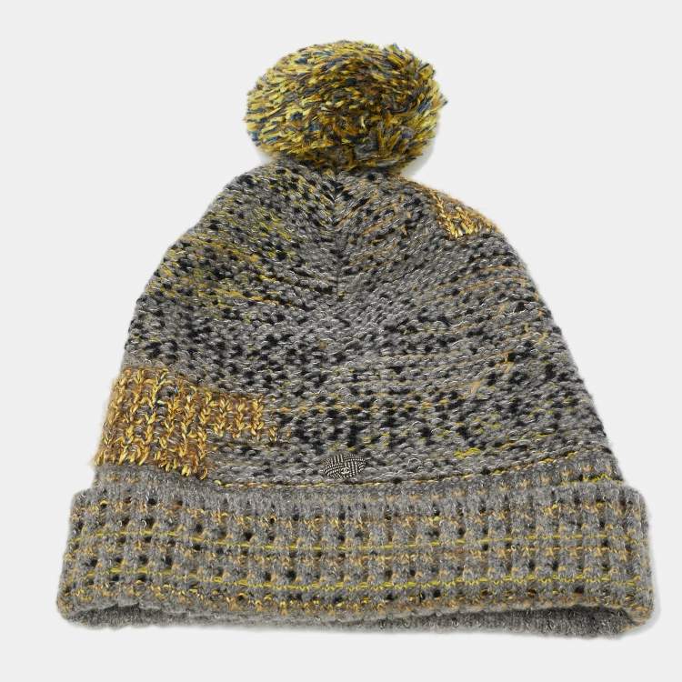 Chanel Grey/Yellow Wool Blend Knit Pom Pom Beanie M