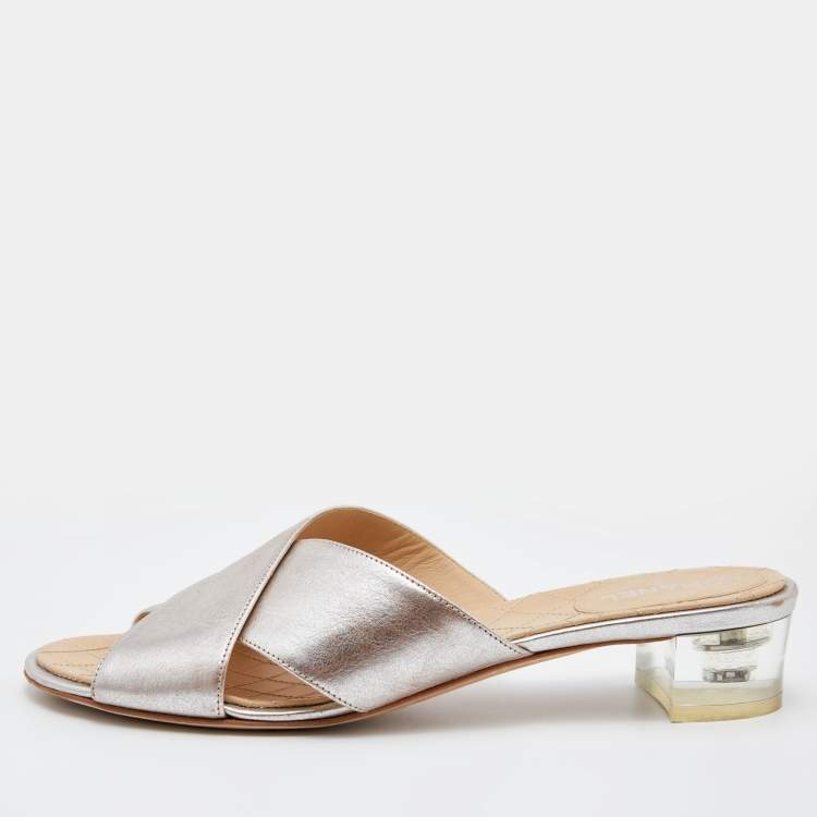 Pre Owned Chanel Metallic Beige Leather Cross Strap Slide Sandals Size 39