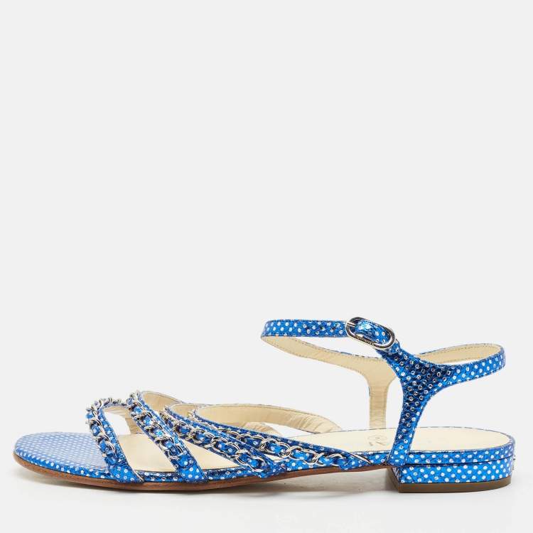 Chanel Metallic Blue Leather Chain Detail Strappy Sandals Size 39.5