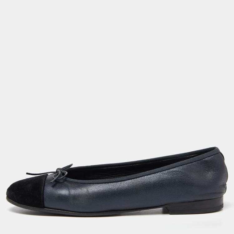 Chanel Metallic Blue/Black Leather and Velvet CC Cap-Toe Bow Ballet Flats Size 40.5
