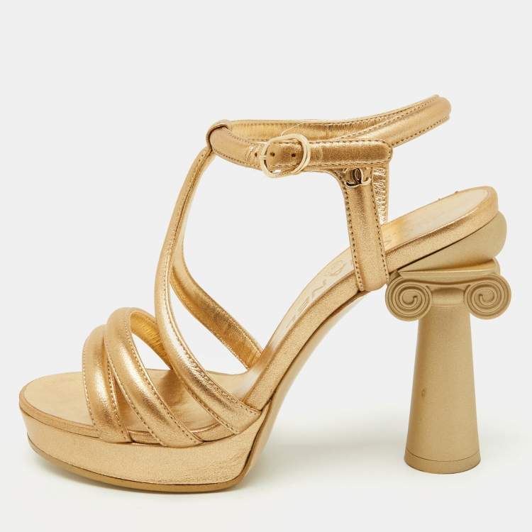 Pre Owned Chanel Metallic Gold Leather Parthenon Grecian Column Platform Sandals Size 36