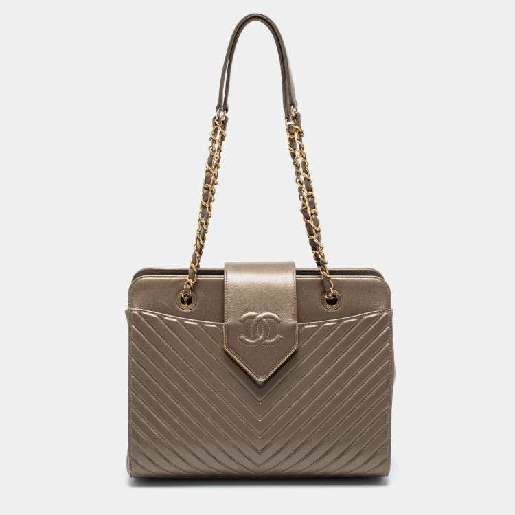 Chanel Metallic Olive Green Chevron Quilted Leather Collar And Tie Shoulder Bag