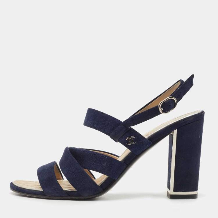 Pre Owned Chanel Navy Blue Suede Block Heel Ankle Strap Sandals Size 38
