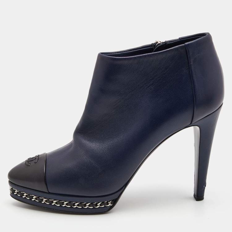 Chanel Navy Blue/Black Leather Cap Toe Ankle Boots Size 38.5