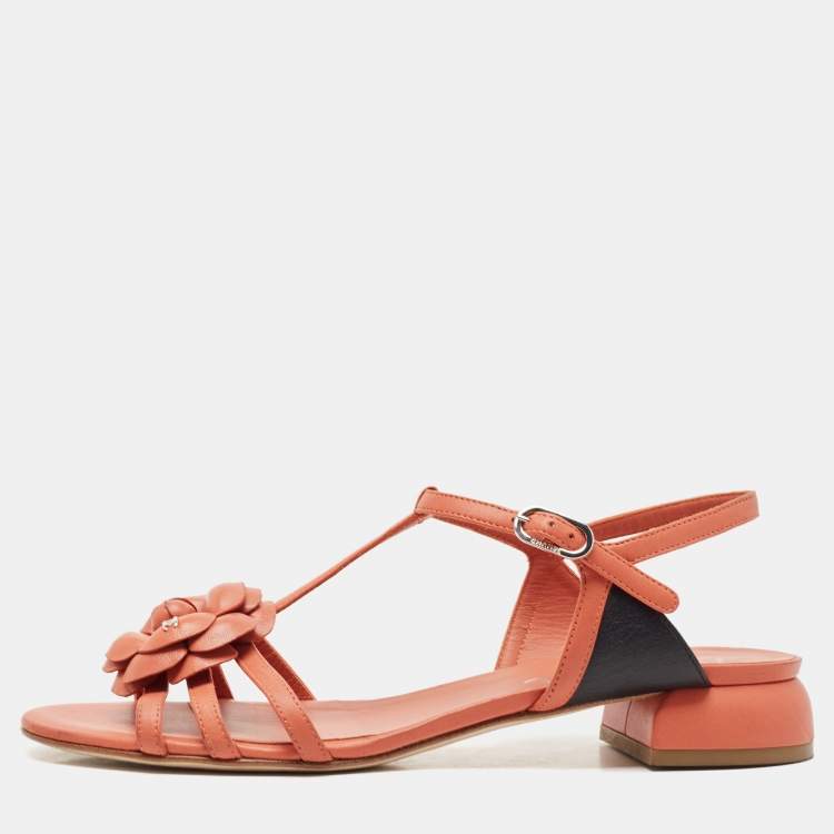 Pre Owned Chanel Orange Leather Camelia Thong Slingback Sandals Size 38.5