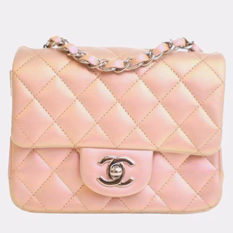 Pre Owned Chanel Pink Mini Square Classic Iridescent Calfskin Single Flap
