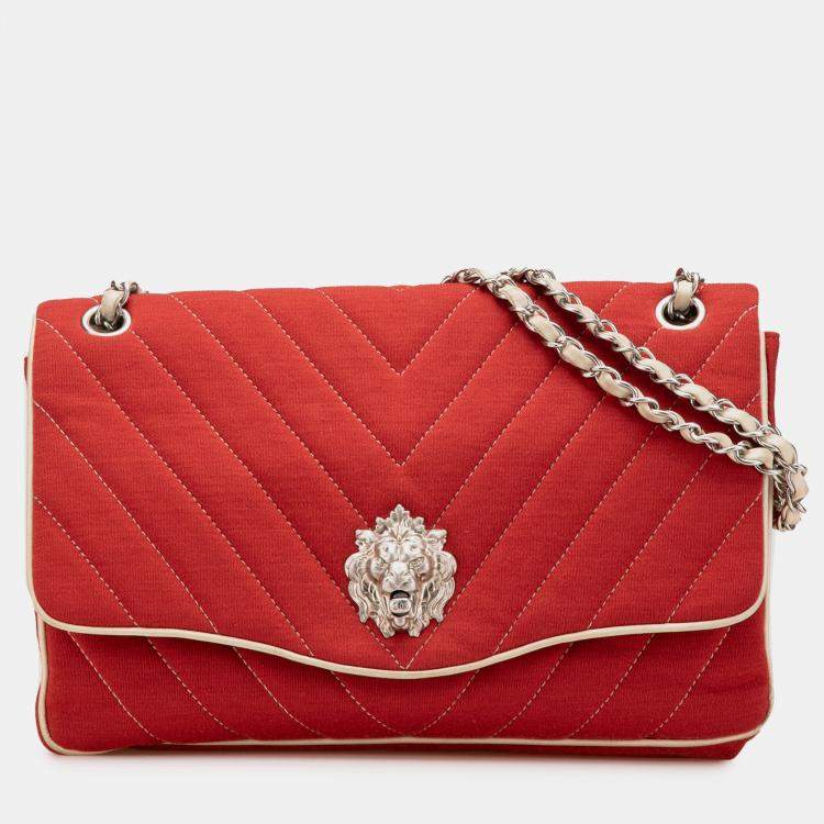 Pre Owned Chanel Red Jumbo Chevron Jersey Leo Lion Flap