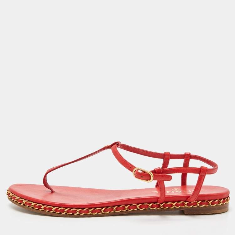 Pre Owned Chanel Red Leather CC Chain Flat Ankle Strap Sandals Size 41