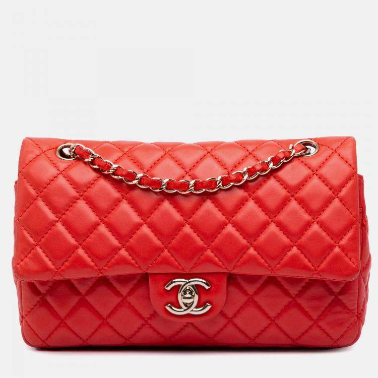 Pre Owned Chanel Red Medium Classic Lambskin Double Flap