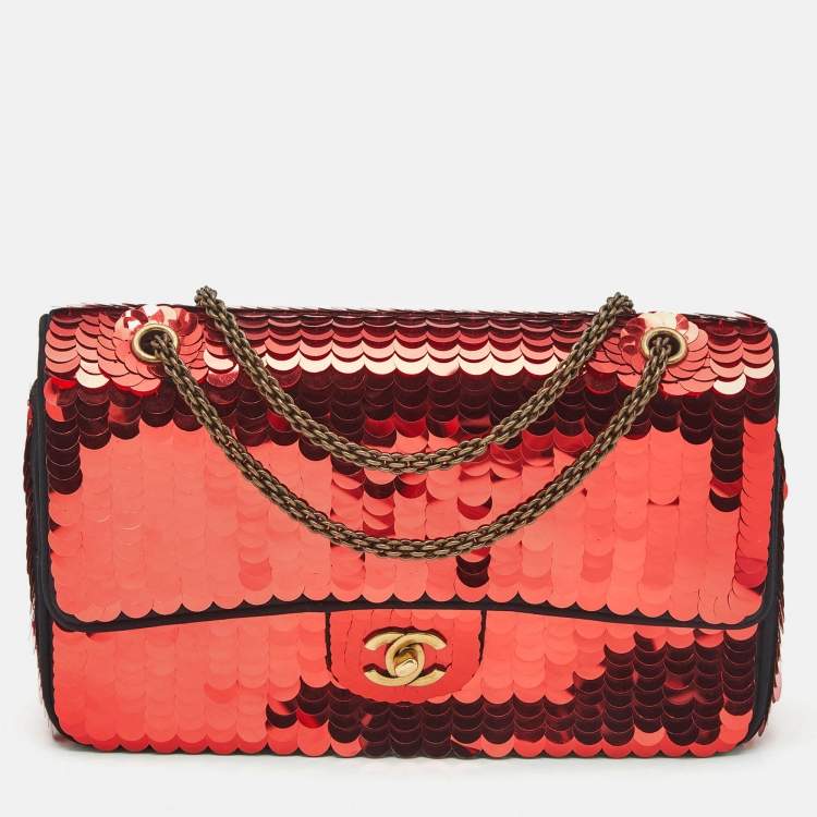 Chanel Red Sequin Satin Medium Paris-Shanghai Classic Double Flap Bag