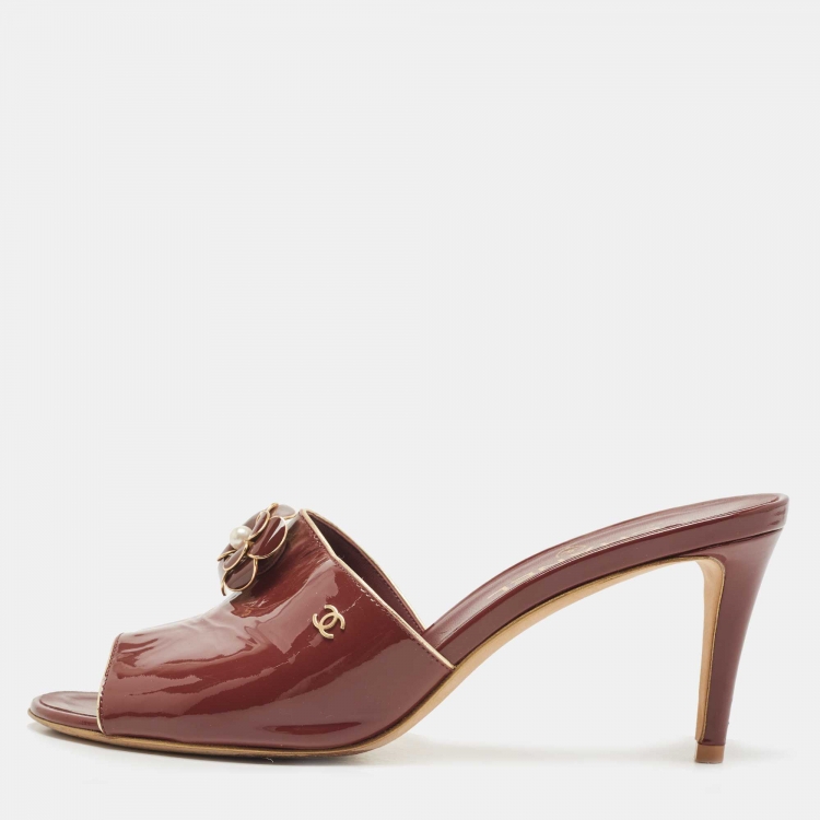 Chanel Burgundy Patent Leather Flower Embellished Slide Sandals Size 39