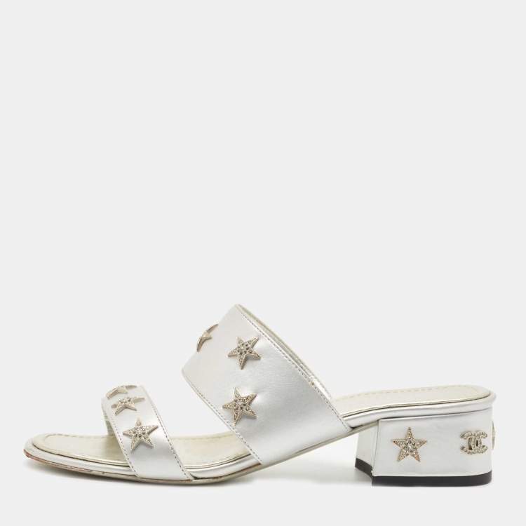 Chanel Silver Leather Embellished Slide Sandals Size 36