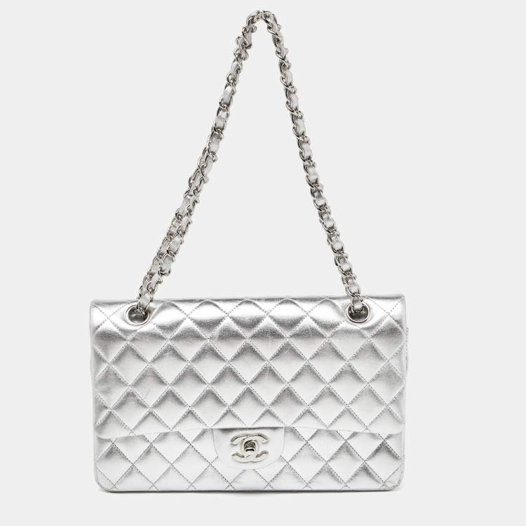 Chanel Silver Quilted Leather Medium Classic Double Flap Bag