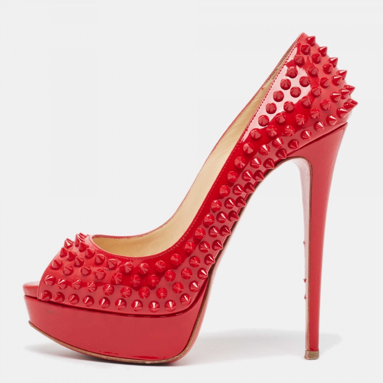 Christian Louboutin Red Patent Leather Lady Peep Spikes Pumps Size 38
