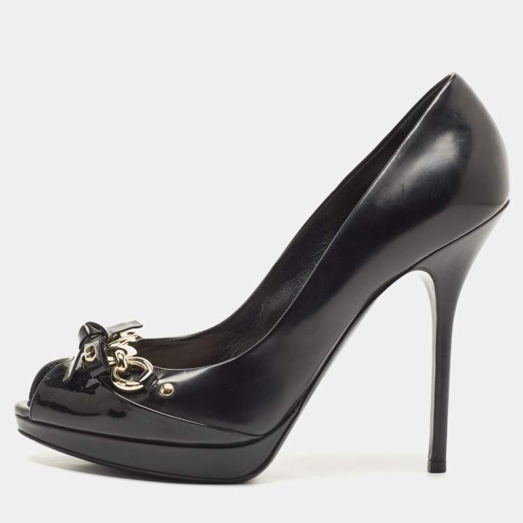 Pre Owned Dior Black Patent Leather Bow Chain Detail Peep Toe Pumps Size 39.5