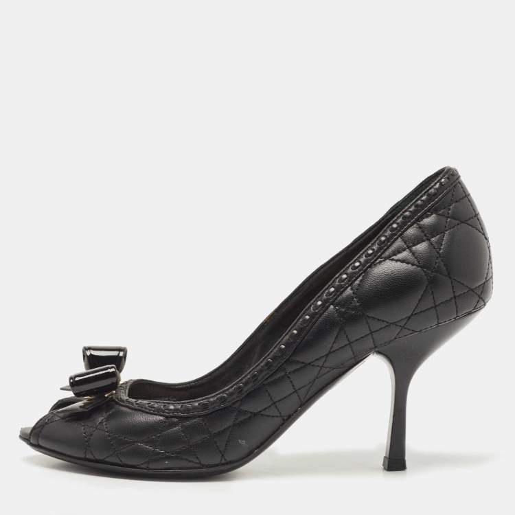 Dior Black Quilted Cannage Leather And Patent Bow Detail Peep Toe Pumps Size 37