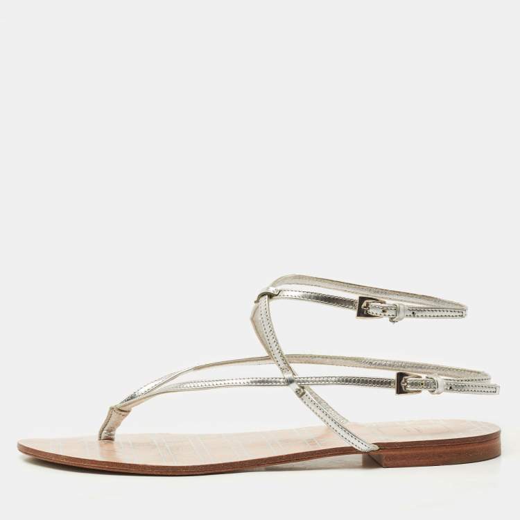 Pre Owned Dior Silver Leather Crystal Embellished Logo Thong Ankle Strap Flat Sandals Size 38