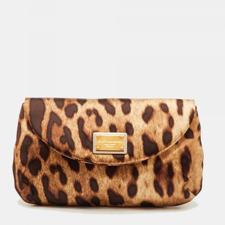 Dolce & Gabbana Brown Leopard Print Satin Flap Clutch