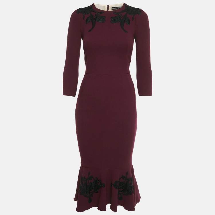 Pre Owned Dolce & Gabbana Burgundy Floral Applique Wool Sheath Dress S