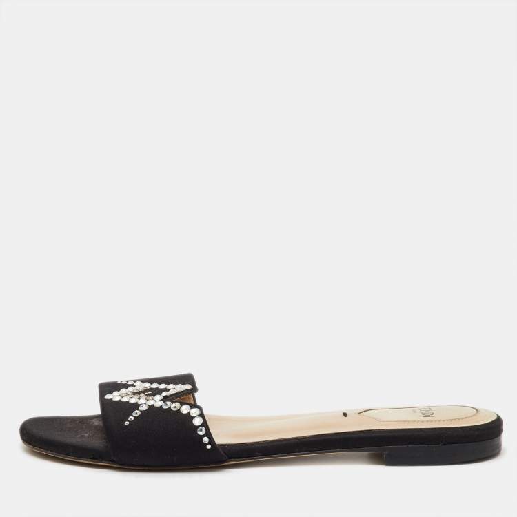 Pre Owned Fendi Black Satin Crystal Embellished Flat Slide Sandals Size 36