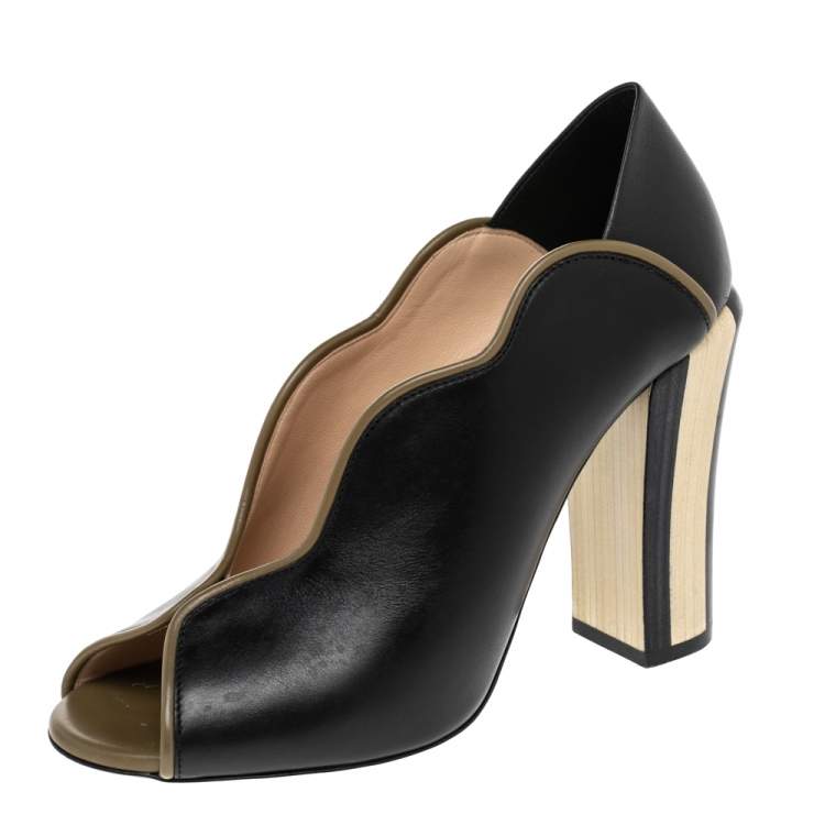Fendi Black/Olive Green Wave Leather Block Heel Peep Toe Pumps Size 37
