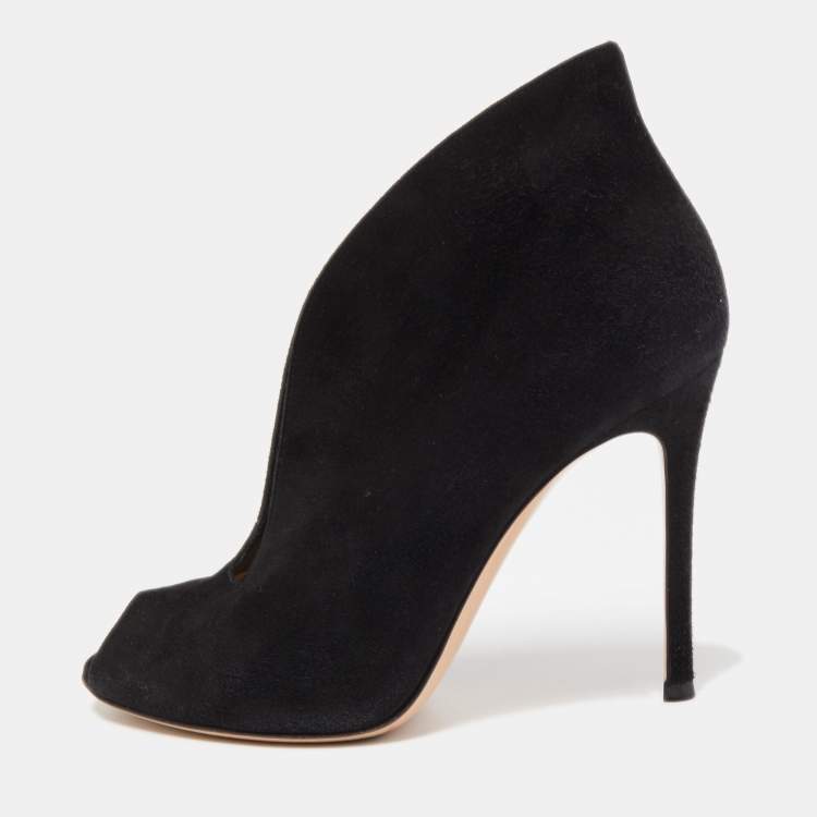 Pre Owned Gianvito Rossi Black Suede Vamp Peep Toe Booties Size 36.5