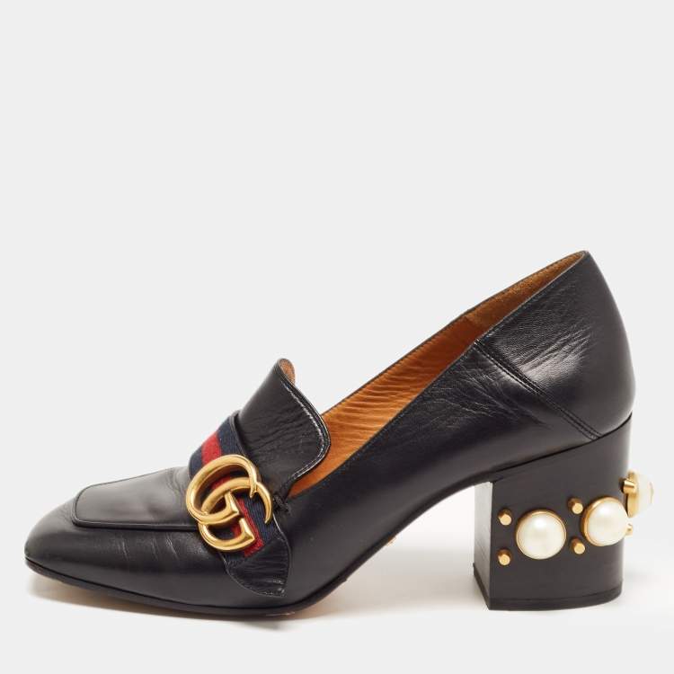 Pre Owned Gucci Black Leather Pearl Embellished Double G Web Mid Heel Loafer Pumps Size 38
