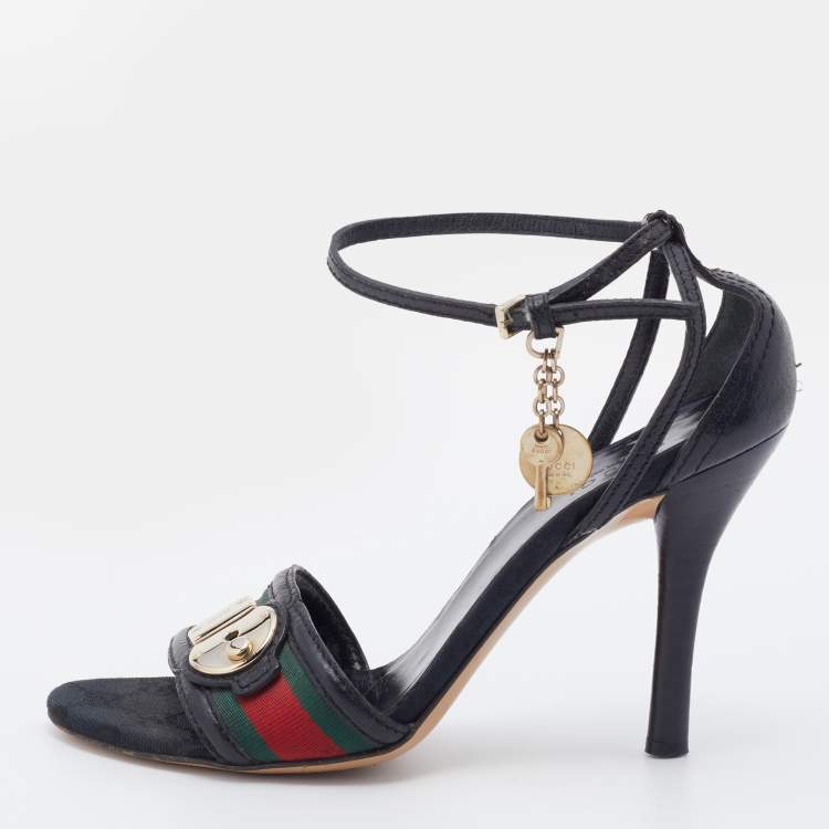 Gucci Black Leather Web Lock Charm Detail Ankle Strap Sandals Size 36.5