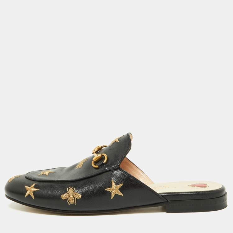 Gucci Black/Gold Leather Bee and Star Embroidered Princetown Flat Mules Size 37