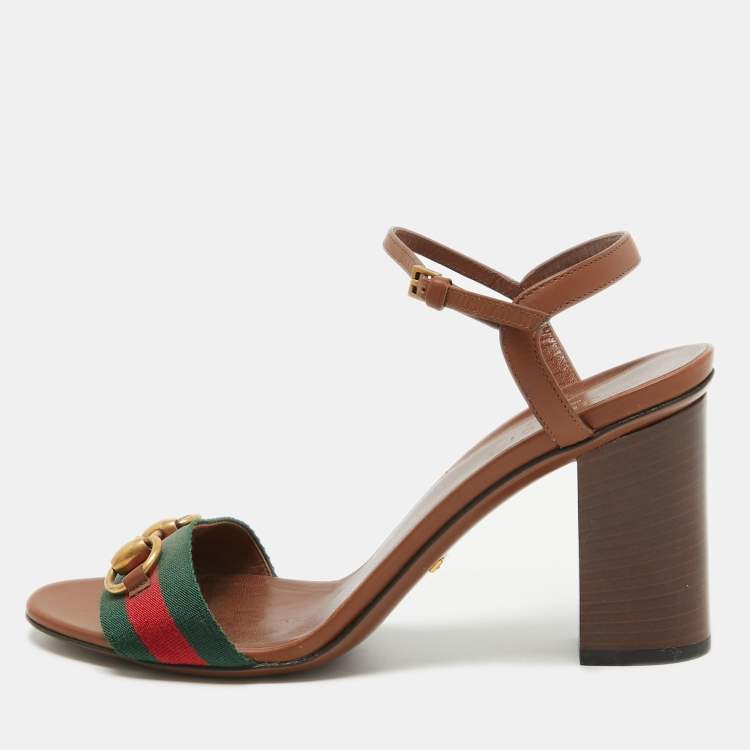 Gucci Brown Leather Web Horsebit Ankle Strap Sandals Size 38.5