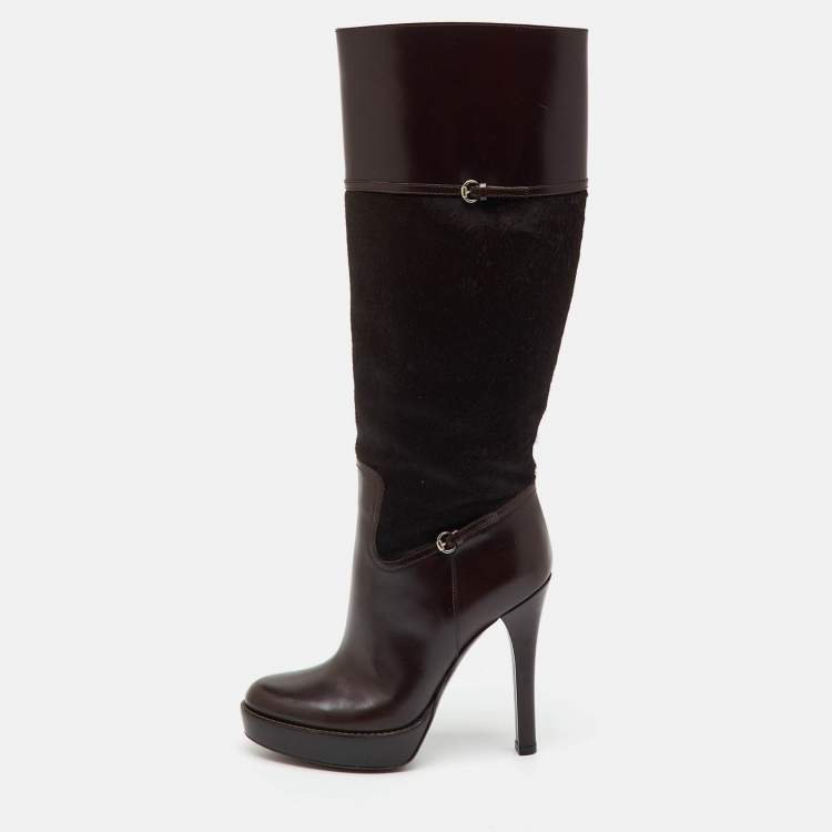 Pre Owned Gucci Dark Brown Leather and Calf Hair Knee Length Platform Boots Size 36.5