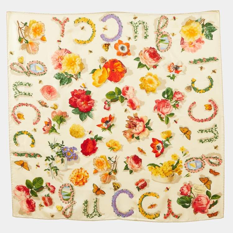 Gucci Light Beige Floral Butterfly Print Silk Scarf