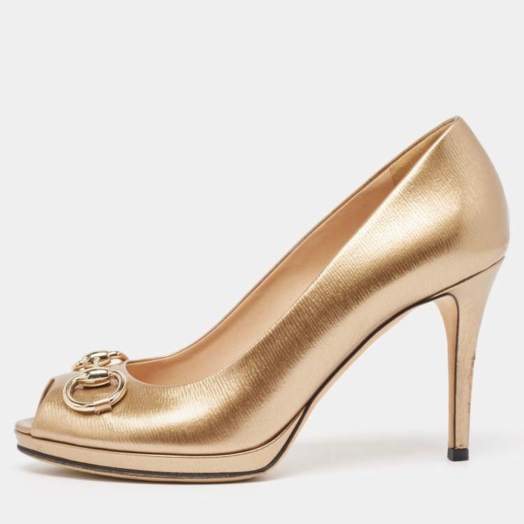 Gucci Metallic Leather Horsebit Peep Toe Platform Pumps Size 38