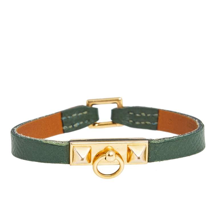 Hermès Green Leather Gold Plated Micro Rivale Bracelet S