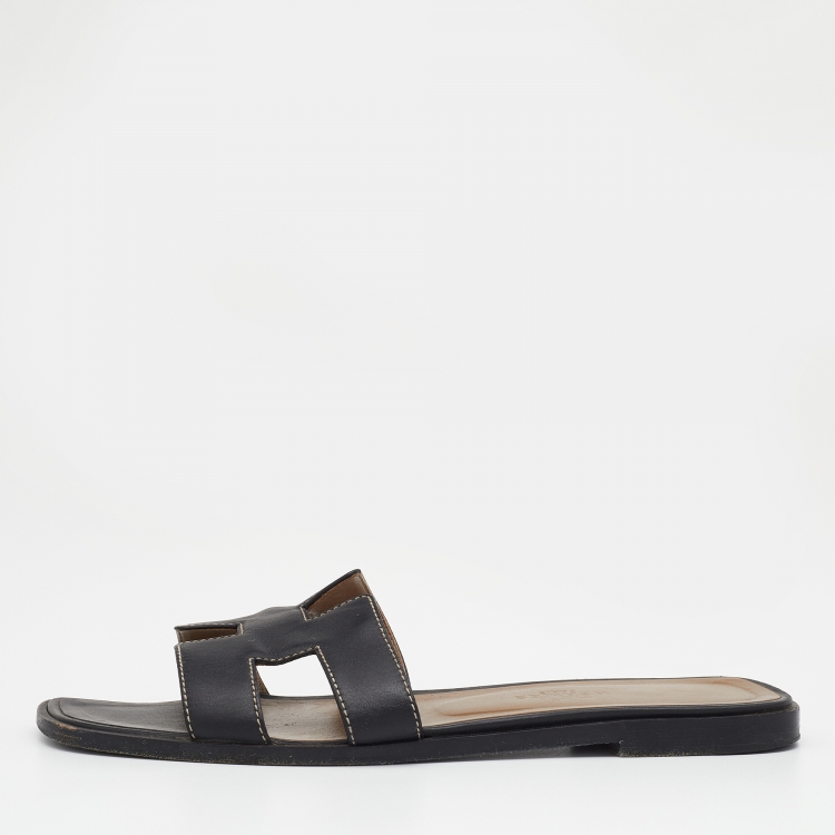 Pre Owned Hermes Black Leather Oran Flat Slide Sandals Size 36