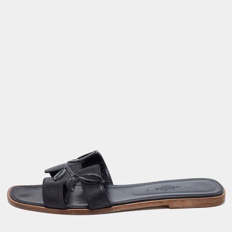 Pre Owned Hermes Black Leather Oran Laurier Flat Slide Sandals Size 40.5