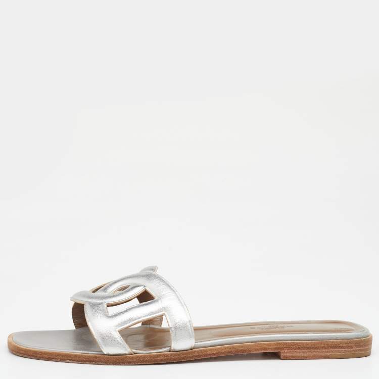 Hermes Metallic Silver Leather Omaha Flat Slide Sandals Size 38