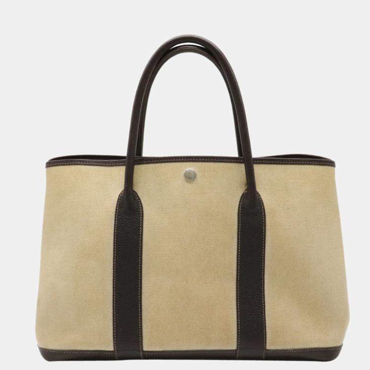 Pre Owned Hermes Toile Ash Buffle Leather Khaki Beige/Dark Brown Garden PM Handbag