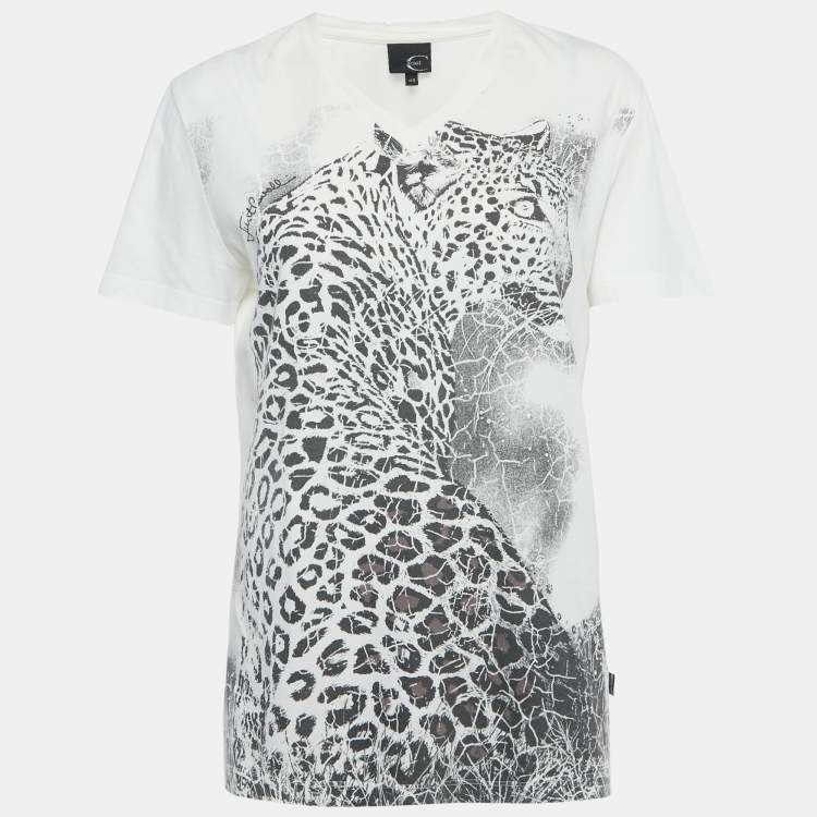 Just Cavalli White Printed Cotton Distressed V-Neck T-Shirt L