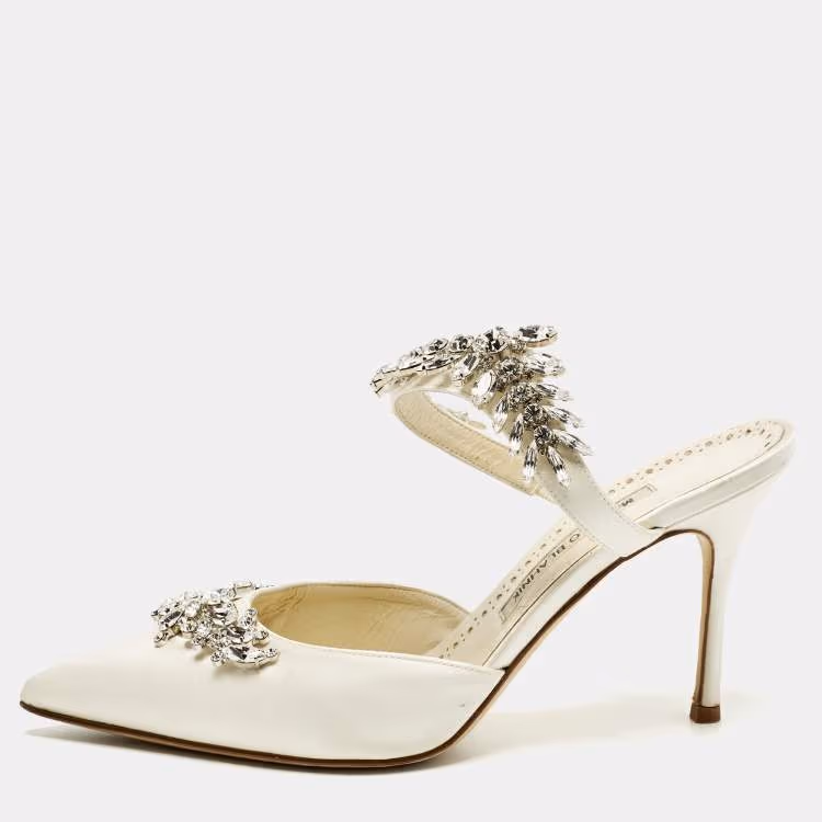 Pre Owned Manolo Blahnik Lurum Crystal Embellished Size 39.5 Ivory Satin Mules