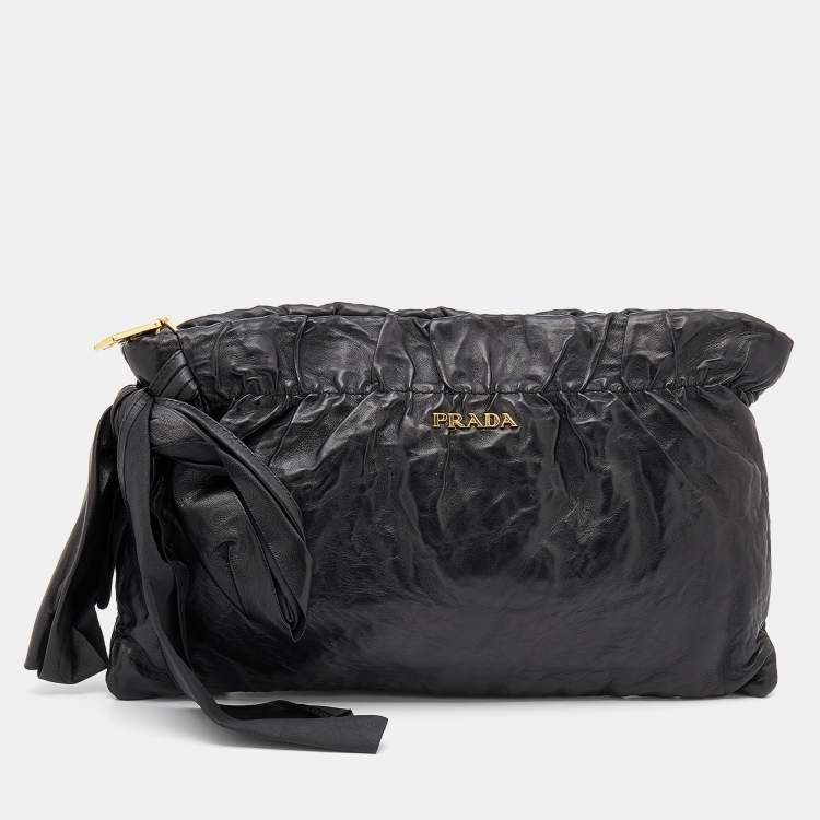Pre Owned Prada Black Leather Antique Large Bow Zip Clutch