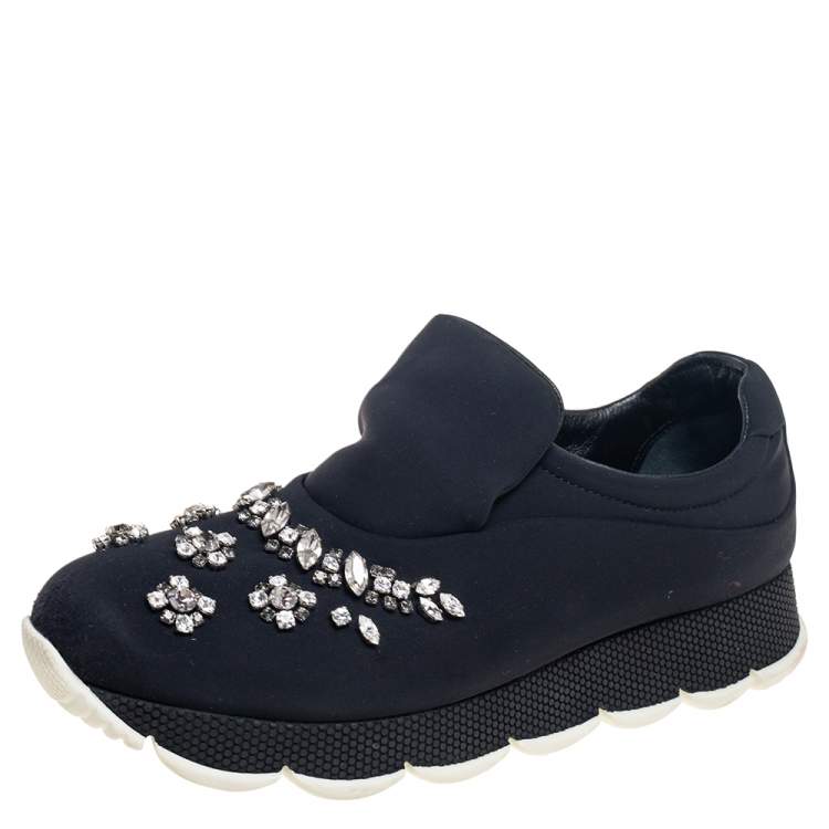 Prada Black Nylon Crystal Embellished Slip On Sneakers Size 40