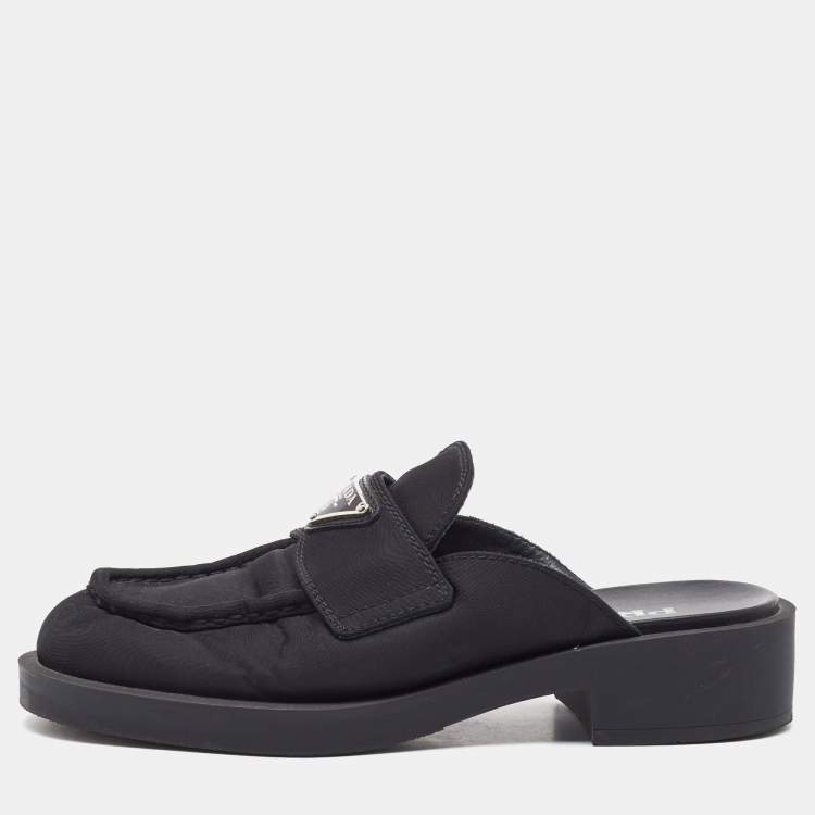 Prada Black Nylon Triangle Logo Loafer Mules Size 36