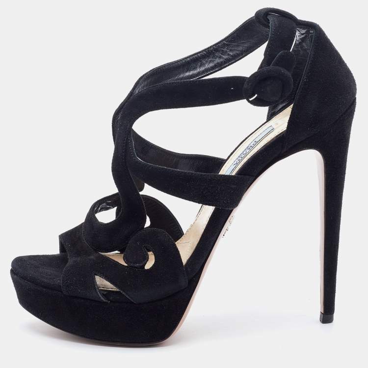 Prada Black Suede Open Toe Baroque Platform Sandals Size 38