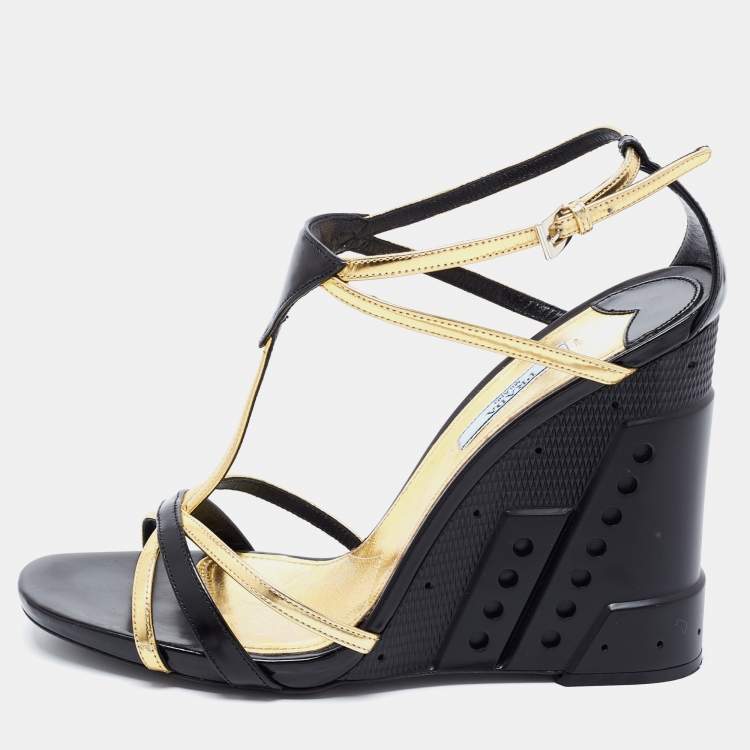 Prada Black/Gold Leather T-Strap Wedge Sandals Size 40